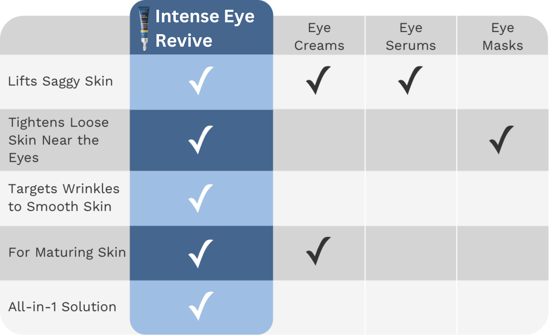 Intense Eye Revive, clinically formulated to eliminate bags, fine lines and wrinkles around the eye area in just one application, exclusively for women aged 50+.